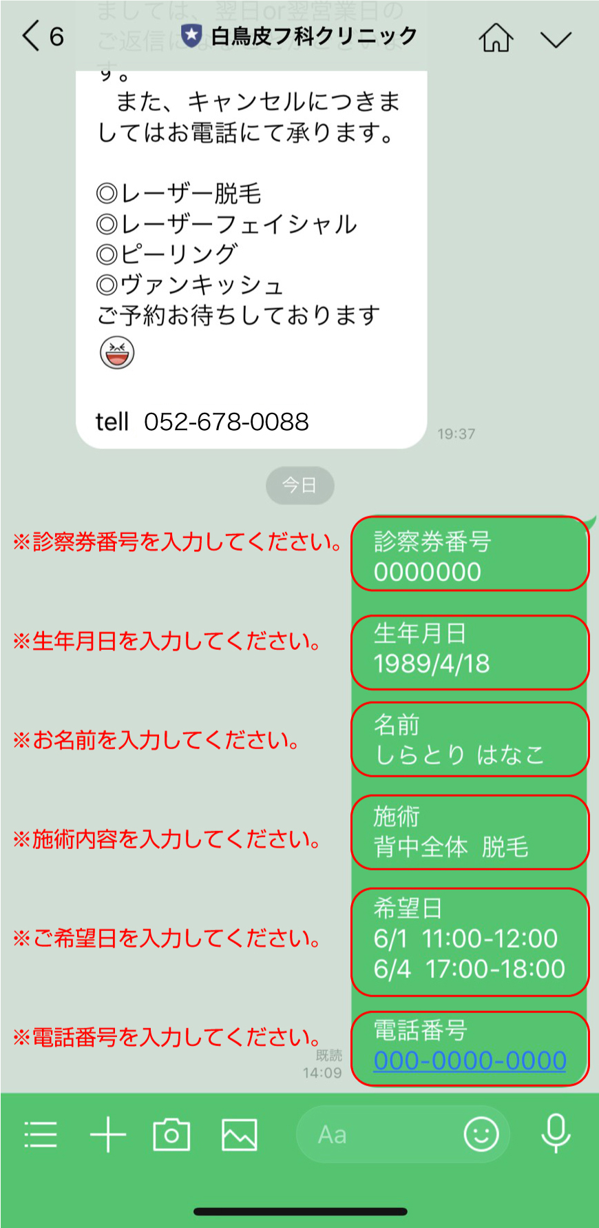 2.メッセージにて診察券番号・生年月日・お名前・施術内容・ご希望の日時(第2希望まで)・携帯番号を送信お願い致します。