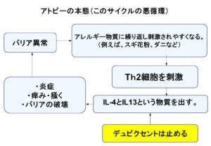 バリアを守るには片親がアトピーで遺伝的素因がある子は、早い時期から常に保湿剤を塗った方がいいし、アレルゲン検査で、スギ、ダニが過敏になっていれば、空気清浄機を置くとか、掃除をするとか、舌下免疫療法をやったほうがいいし、デュピクセントは分子レベルで元を断つのが良いことだし、痒みや炎症に対しては光線療法、ステロイドの外用、プロトピック外用、かゆみ止め内服することは有効と思われます。
