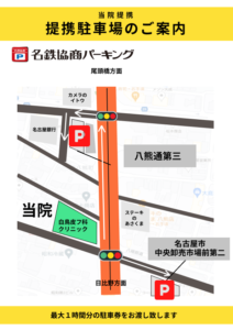 R3年7月1日よりタイムズ明野第二駐車場がご利用いただけません。新たな提携先は、名鉄協商パーキング八熊通第三・名古屋市中央卸売市場前第二の2か所になります。最大1時間分の駐車券をお渡し致します。必ず精算機にて駐車券を発行してからご来院下さい。ご迷惑をお掛け致しますがよろしくお願い致します。