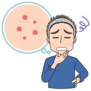 ◦男性の肌にニキビができてしまう仕組み。 生活習慣の乱れなどの理由によって、必要以上に分泌された皮脂が適切にケアされずに毛穴に残ってしまうと、コメドという角栓になり毛穴詰まりが起きます。 出口を失った皮脂は毛穴の中に詰まり続け、皮脂をエサとする「アクネ菌」が繁殖。アクネ菌と戦うために皮脂が炎症を起こし、痛みや膿を伴う「ニキビ」に発展してしまうという仕組みです。 ◦ニキビを悪化させるNG行動。 ①ニキビに触る。 毛穴から手の雑菌が侵入することで、今あるニキビが悪化したり新たなニキビができる可能性があります。 誤ってニキビをつぶしてしまうと、痕に残って治りにくくなるおそれもあります。 ②保湿をしない。 保湿が足りないと肌が乾燥し、逆に皮脂の分泌を促してしまう可能性があります。油分の少ないスキンケアアイテムを使うなどの工夫は必要ですが、ニキビのある時でも必ず」スキンケアを行いましょう。 ③食生活を見直す。 肉食がニキビを増やしてしまいます。なので肉や油分の多い食事を減らし、バランスの良い食事を心がけましょう。特に肌を作る「タンパク質」、ターンオーバーを促進する「ビタミン類」、ニキビの原因にもなる便秘を防ぐ「食物繊維」を中心に、様々な栄養をバランス良く摂取することが大切です。 その他適度な運動をして血行を促進し、十分な睡眠を取る事を心がけてください。