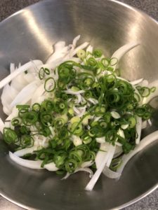 ①ボール千切りした玉ねぎとじゃこ、ねぎ、塩を入れて軽くまぜる。